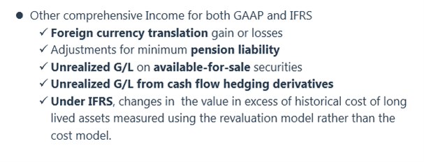 具体会影响到OCI的金额的主要有4+1项,具体可以见下图,而其他不包括在OCI中的都是影响NI在影响retained earnings的哦