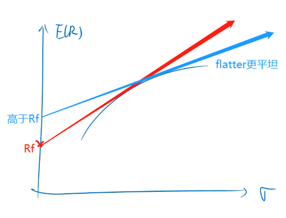 如果Rf借款成本增加,那么投资者将以新的借款(蓝色)成本来投资,意味着有更加平缓的一条切线。