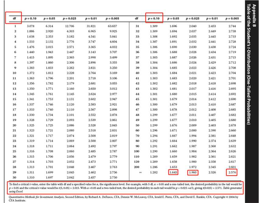 以t分布表为例(原版书Appendix中有Students´ t-Distribution,并且是单尾概率),纵为自由度df,横为“desired probability”(用p表示)。