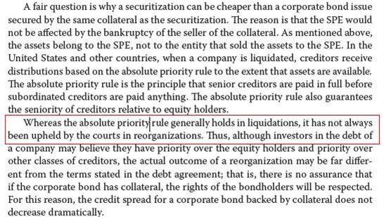 说的是absolute priority rule 绝对优先权原则,是说公司破产时保护高级债权人权益的原则,比如优先股东先于普通股东提出求偿。但是在破产清算重组公司时,法院并不支持这种严格的绝对优先权原则。