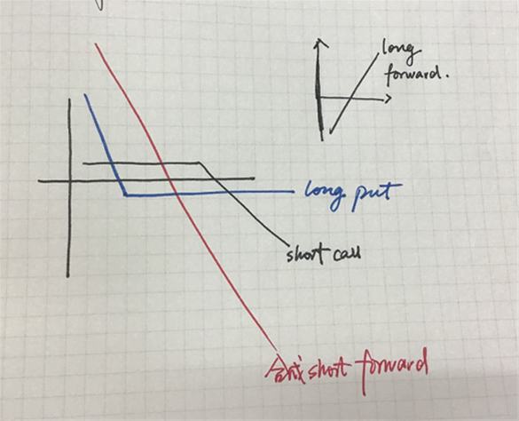 另外,short call+ long put可以合成一个short forward contract(向下45度的直线),那45度向上的斜线是long forward contract.