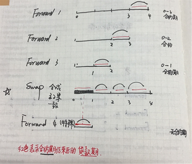 而多个Forward在期初可以合成Swap的效果,如附图,此时多个Forward并不是Valuation=0。如果假设forward对应支固定收浮动中的固定一方,意味着未来对个时间点支付固定现金流,而多笔支付固定现金流合成的效果是:期初支付固定现金流等于收到浮动现金流,这样支付收到平了,是有点难,因为是二级的内容,换一句话说,多个Forward在期初等价于收到浮动现金流,所以off-market forward的valuation不等于0
