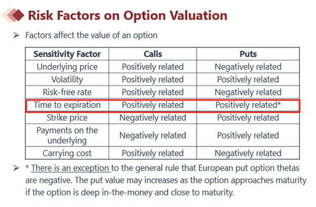 如果有A:3个月和B:1天到期的两个call option,都是out of the money,肯定是A:3个月到期这个期权价格高,因为还有3个月的时间,由out of the money转为 in the money的可能性大。B:1天到期的call option相当于尘埃落定,不值钱。