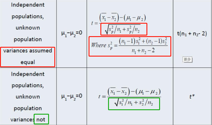 两个总体均值的检验,区别在于总体的方差是否相等,分别对应截图的两行。