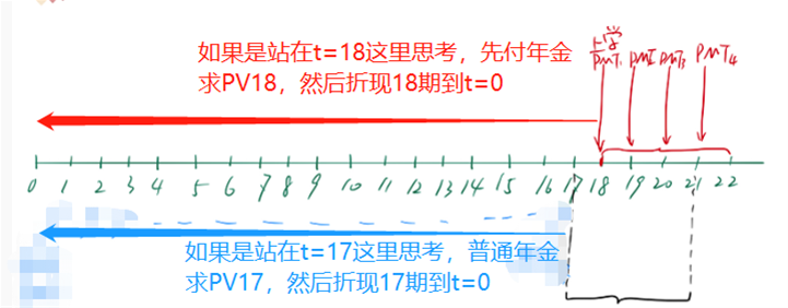 站在t=17时间点思考,那么学费4笔是普通年金,站在t=18时间点思考,学费4笔是先付年金。