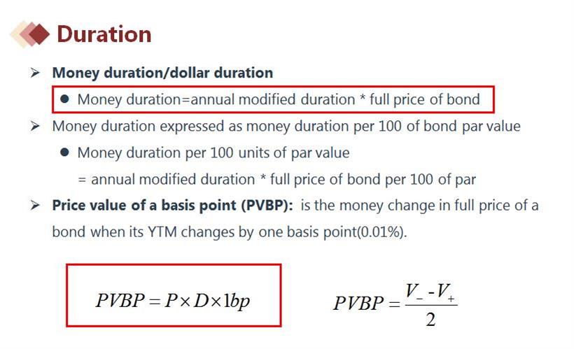 PVBP(跟money duration 概念类似)但这里不是债券利率变动百分之一,而是债券利率变动1bp(也就是0.01%时)债券价格变动多少元,∆p=D*P*∆y(∆y=1bps),∆p就是PVBP。