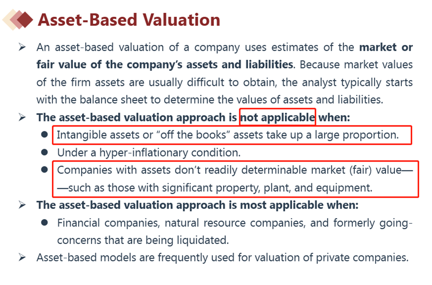 这里理解有个误区哦,asset based model是不适用公司有大量的无形资产。