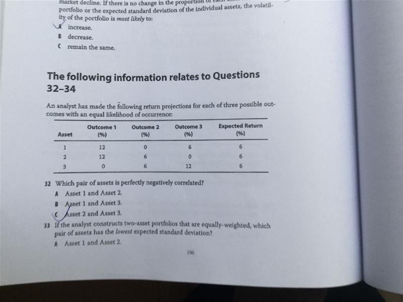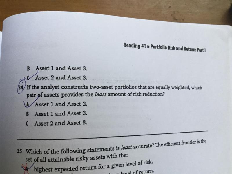 同学你好,这题可以通过简单的画图来明晰,把三个资产的数值都用线连起来就清楚了,或者根据概念,相关系数越大的组合风险减缩的效果更低,负相关的更高。