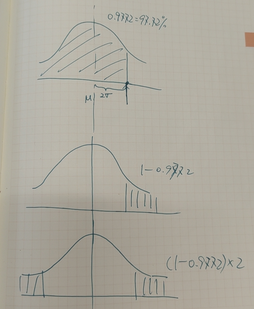 又因为正态分布左右对称,所以观测值落在均值左右2倍标准差以外是2倍(1-0.9772)=2倍0.0228=0.0456