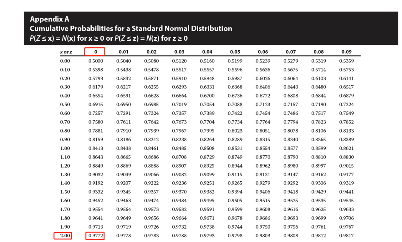 通过查累积概率表,2.00对应的概率0.9772表示观测值落在均值右边2倍标准差以内,观测值落在均值右边2倍标准差以外是1-0.9772