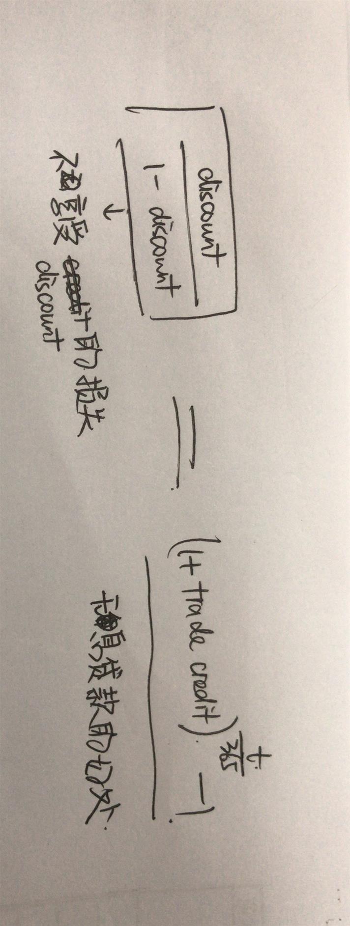 同学你好,这里推导的核心在于,企业享受t天的无息贷款带来的收益应当和不接受discount带来的损失应当是相等的。具体推导见下图