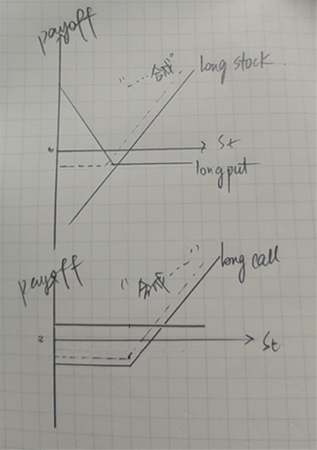 等式右边:long put + long stock,称为"protected put”