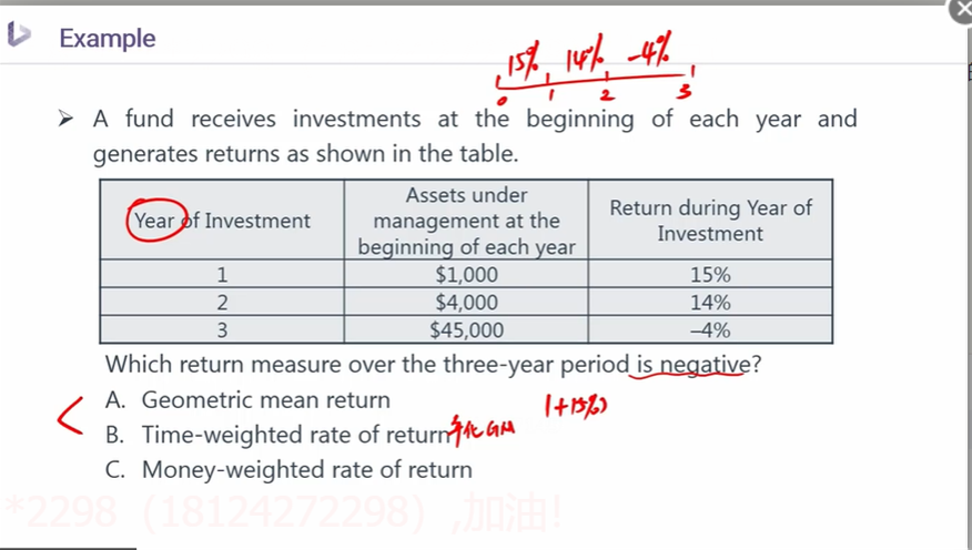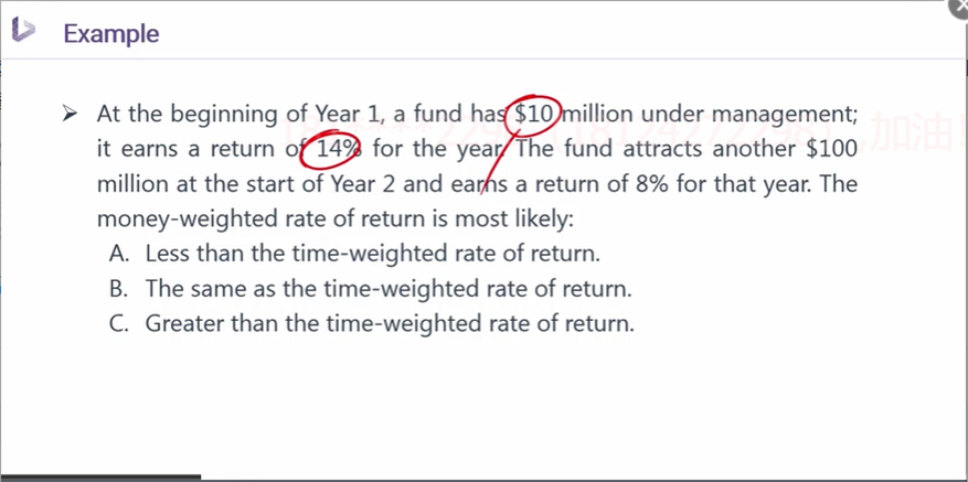 对于这个知识点,如果不清楚,可以抽空仅仅看一下基础班---组合管理---第一个章节---有关收益率的计算MWRR和TWRR。