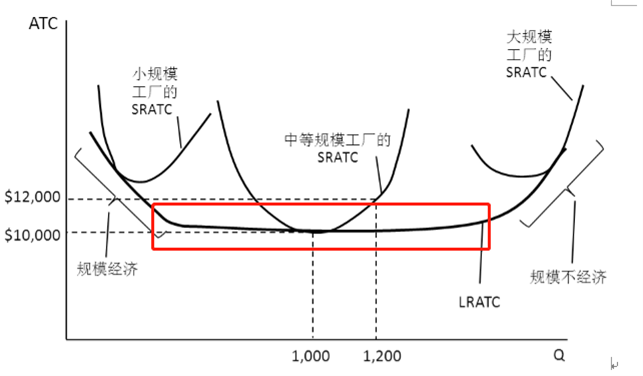 这里边理解起来有个梗,在这个规模不变的点上,增加产量就要成为规模不经济了,减少产量就成规模经济了,对吧??现在要增加产量,还要保持最低的平均总成本,这怎么才能做到呢?搞不清。