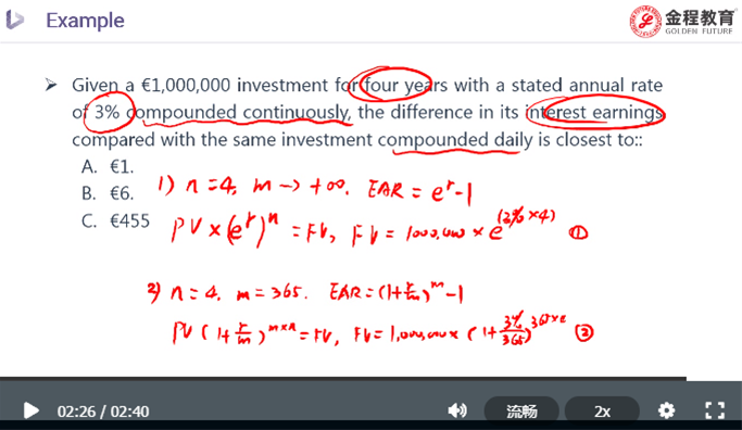 老师,我想问一下,这道题-1或者不-1算出来答案应该是一样的吧?-1就代表扣除了本金,这道题要算interest earned所以按照常理应该-1不算本金的。但是视频讲解里没有-1