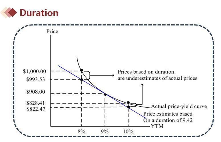 关于 yield 越小,duration 越大,我们可以通过下图看出,当 yield 越小时,曲线的斜率越大,而斜率表示的就是 duration 的大小。所以成反比
