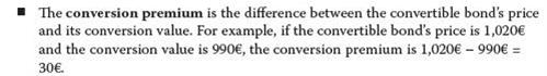 但更严谨的说法应该是:The conversion premium is the difference between the convertible bond’s price and its conversion value.