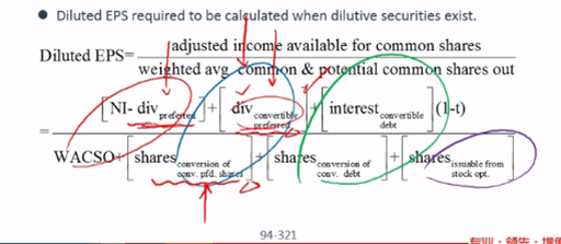 同学你好,计算diluted eps 时公式的第一部分其实就是算basic eps, 在算basic eps时新增股票和回购时需要时间加权平均。diluted eps的公式是在basic eps的基础上,再叠加3个资本结构。所以diluted eps是指当公司有其他资本结构时,公司的eps会如何变化。 可转债和可转换优先股当行权时是变成普通股,他们转换的数量就是新增普通股的数量,含有权证时求eps是用的库存法,指当投资者行权时公司会收到一笔收入,公司收到的这笔收入没有用于其他投资而是全部用来回购公司的股票,权证转化的股票数量减去回购的股票才是新增的股票数量。 关于这部分知识建议可以看下基础班的视频,里面都有详细讲解的。