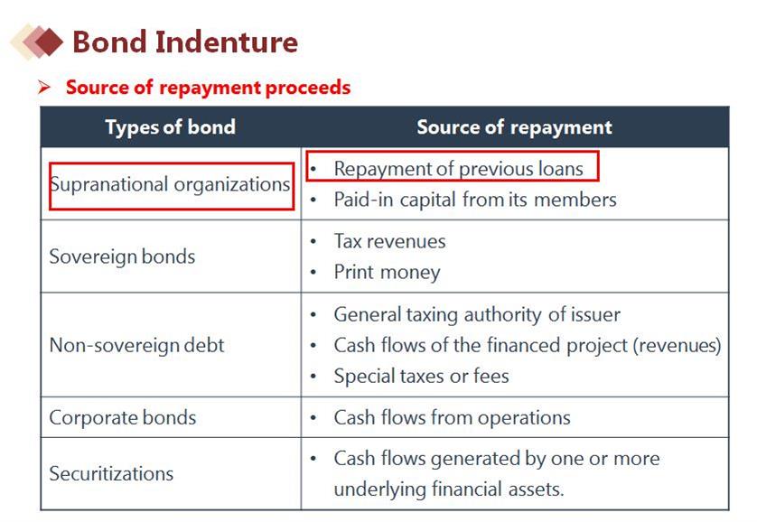 见下图讲义。超国家债券的付款来源是以前贷款的还款。