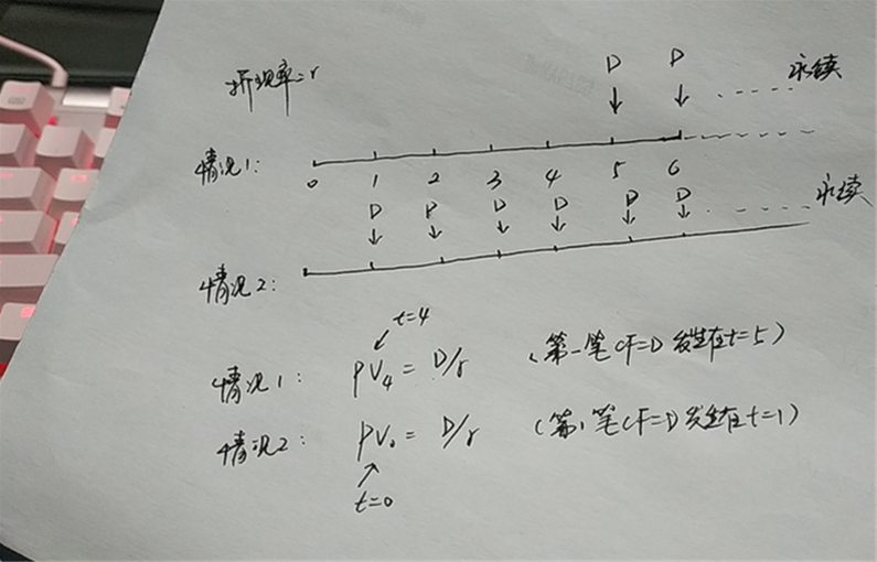 换一个角度,你可以从第一个季度末t=1开始领取分红D,PV=D/r,站在t=0时刻的现值。