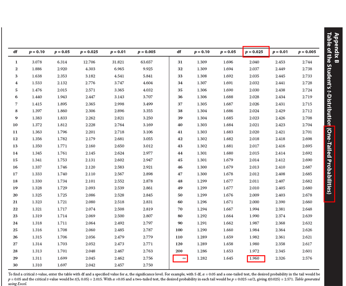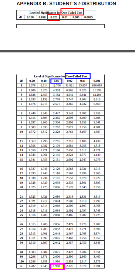 如果给出查表(显著性水平分别是单尾和双尾),对应单尾2.5%和双尾5%的情况下,对应的关键值为1.96