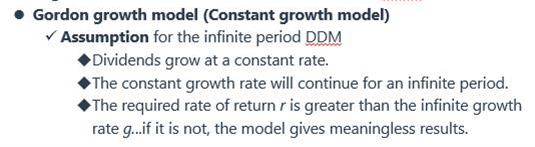 1.股利以恒定的速度g增长。2.没有到期期限,或者说是持续的持有该股票 3.r>g