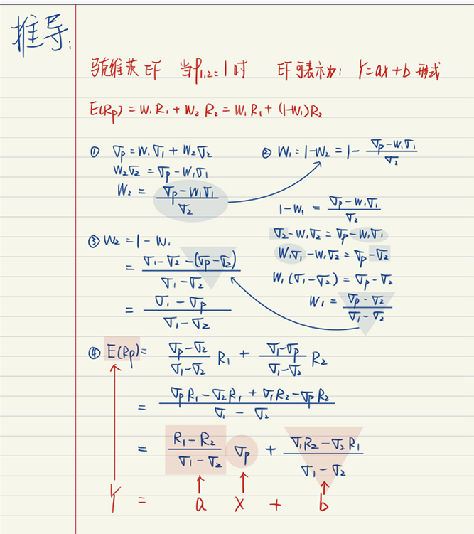 在马科维兹MPT理论中,两个资产的相关系数为+1时,两个资产做组合得到的投资组合,风险和收益的关系是一条直线。推到如附图,在附图中,资产1和2的收益和标准差都是已知的,投资组合的σp和E(Rp)可以由已知的数据表示为Y=ax+b的形式。