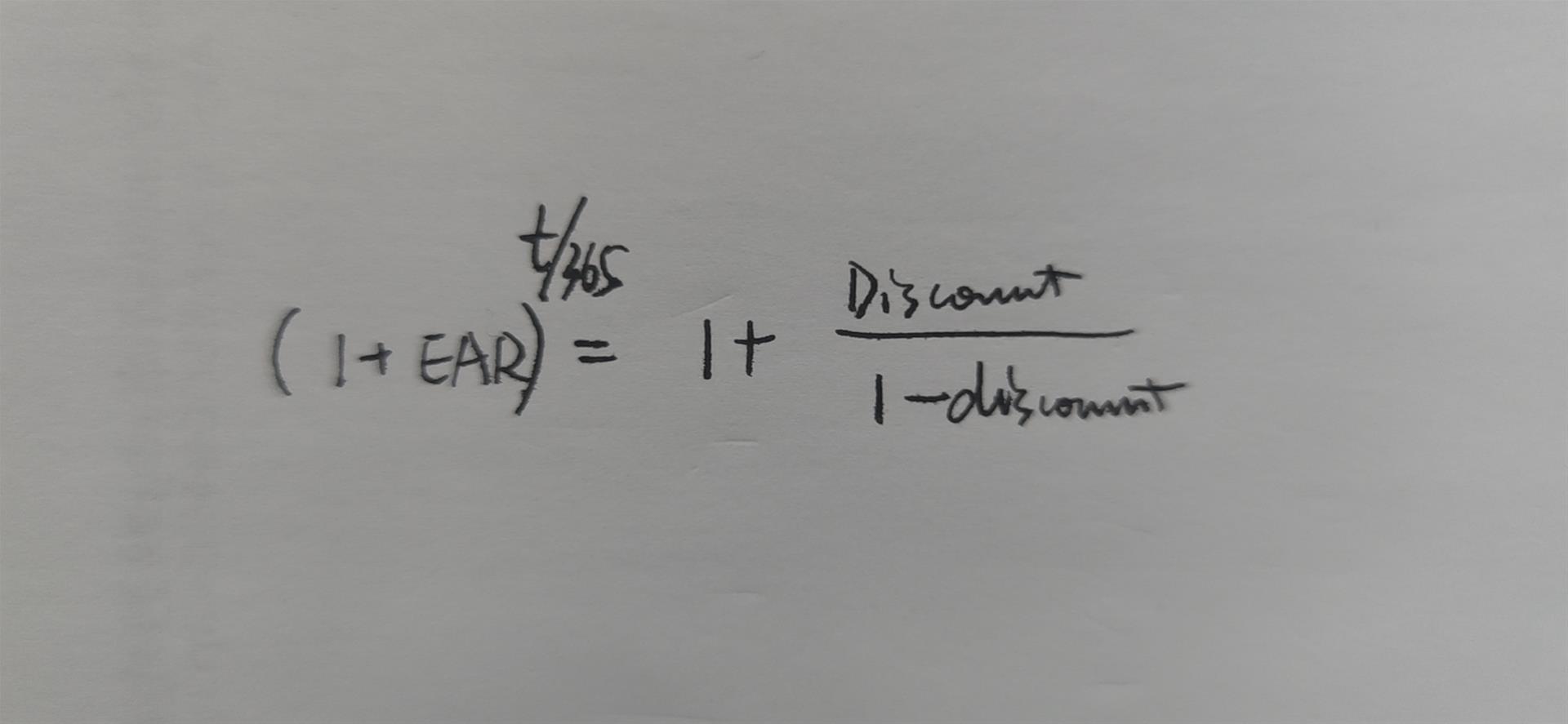 1+EAR的本质是描述一个年化的收益率,然后T表示的“年”,需要将t/365,365是分母,相当于将t标准化为一个单位为“年”的数值。不需要死记硬背公式,按照原理理解,可以把等式移动一下得出附图。