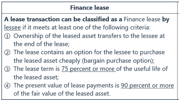 同学你好,只要满足下图四个条件中的一条及以上,即可被认为是融资租赁。