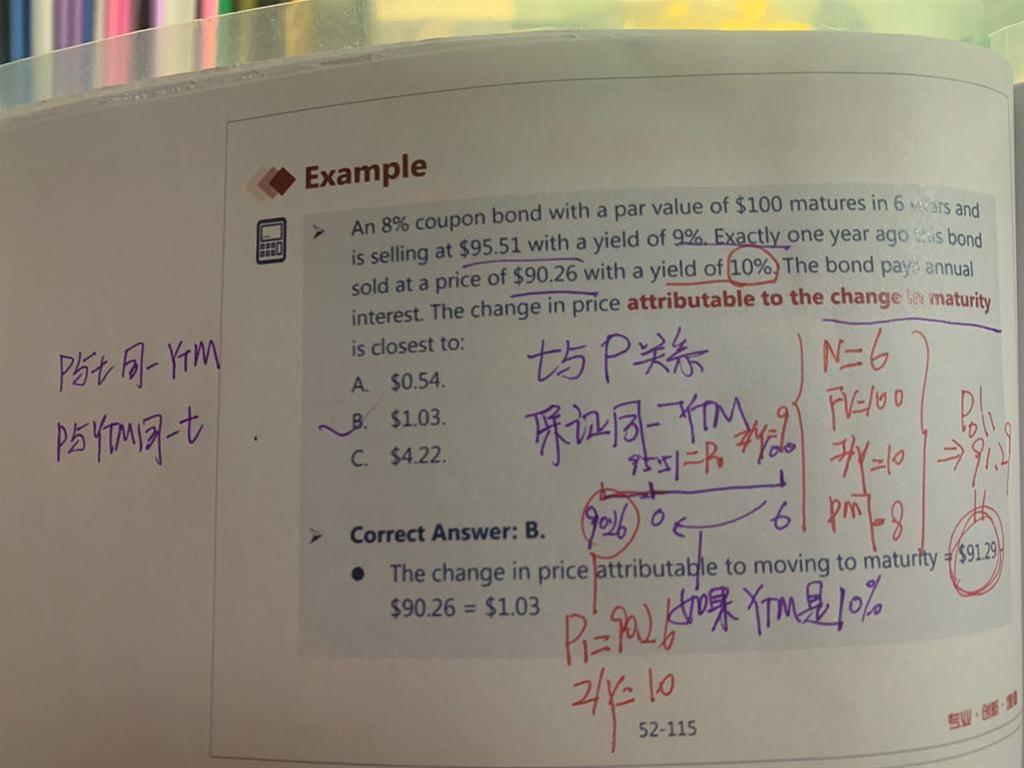这题问的是price attributable to the change in maturity,就是只考虑时间变化对价格的影响,不考虑利率的变化。就用最早的利率不变带入。