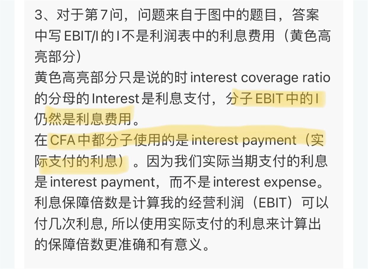3、对于第7问,问题来自于图中的题目,答案中写EBIT/I的I不是利润表中的利息费用(黄色高亮部分)