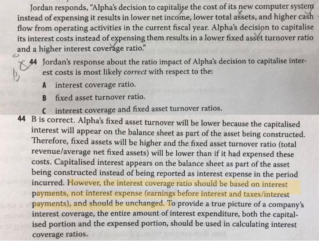 对于EBIT/I,老师的回答好像有点矛盾(图中黄色部分),所以是分子EBIT中的I指利润表的利息费用,分母的I为实际的利息支出(现金流的概念)对吗?考试就这么理解对吧?