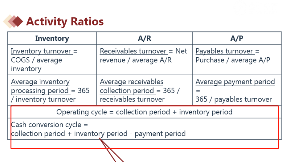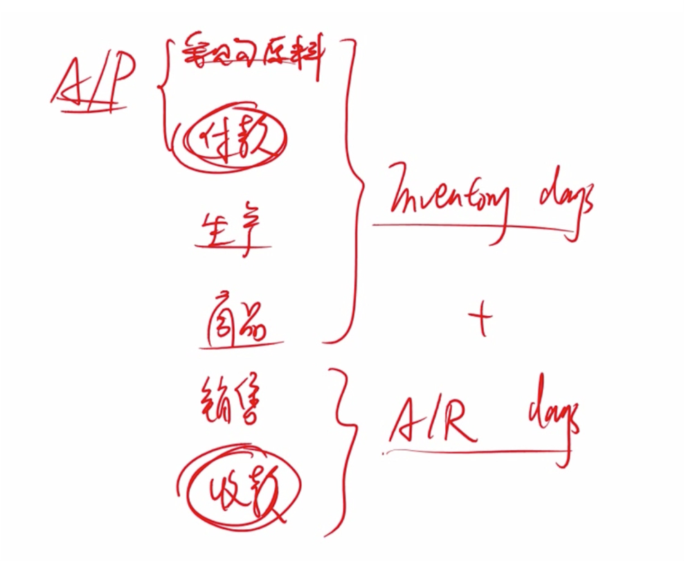 根据韩老师在r35基础视频21分钟左右说到operating cycle是从采购原料到收款这段时间,这是包括a/p的呀,而cash conversion cycle 是从付款到收款(时间缩短了),因此后者才会剪掉a/p,但由此也跟能反应前者是包括a/p的