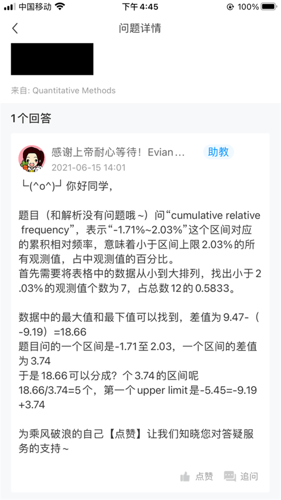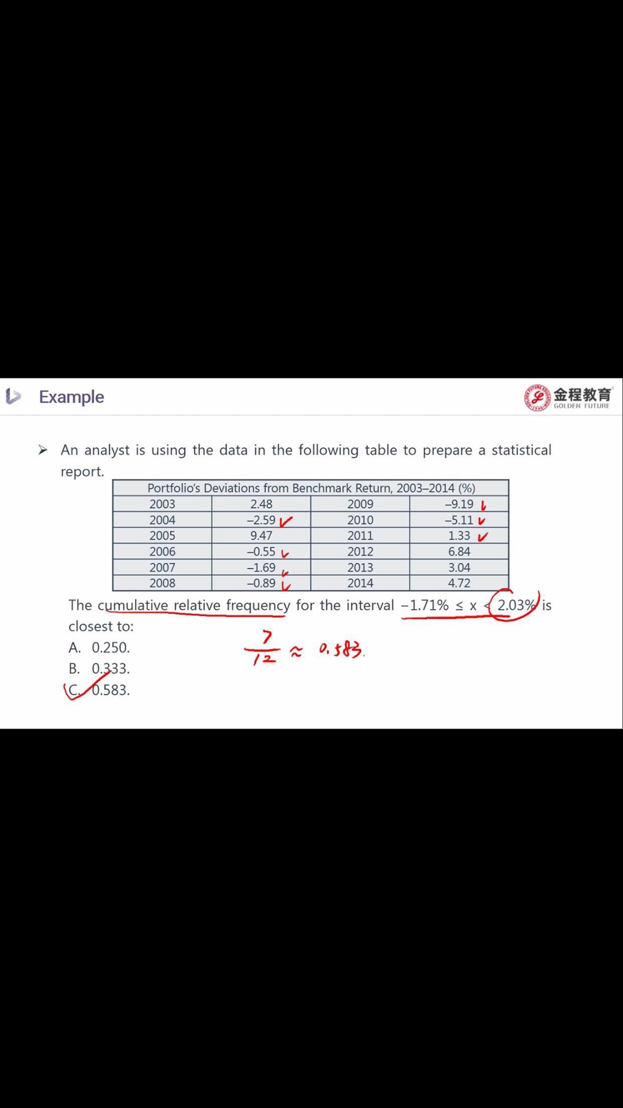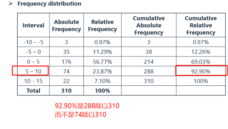 题目(和解析没有问题哦~)问“cumulative relative frequency”,表示“-1.71%~2.03%”这个区间对应的累积相对频率,意味着小于区间上限2.03%的所有观测值,占中观测值的百分比。