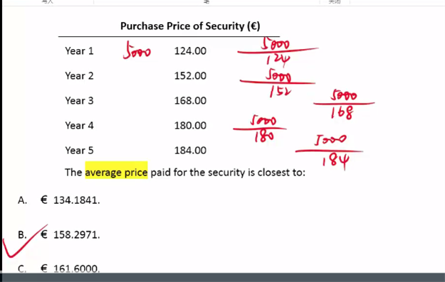 调和平均数适用于确定每一单位的平均价格。各个投资的买入价格不同,最终求的是整个投资组合平均购买价格。