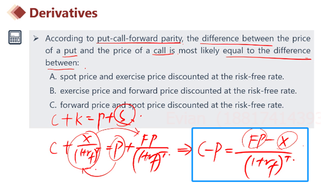 右边是“exercise price X和Forward price FP的差值”然后折现discounted。应该选择B。