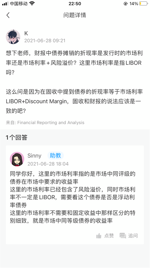 1、由于财报的债券章节和固收中都提到了市场利率,我昨天也问了财报的老师,回答如图,我想结合两位老师的回答再确认下:财报中说债券摊销时的折现率使用发行时的市场利率,这里的市场利率是含风险溢价的,不是指市场参考利率(如LIBOR);而固收中的市场利率就是指市场参考利率(如LIBOR),折现率=LIBOR+Discount Margin,对吧?