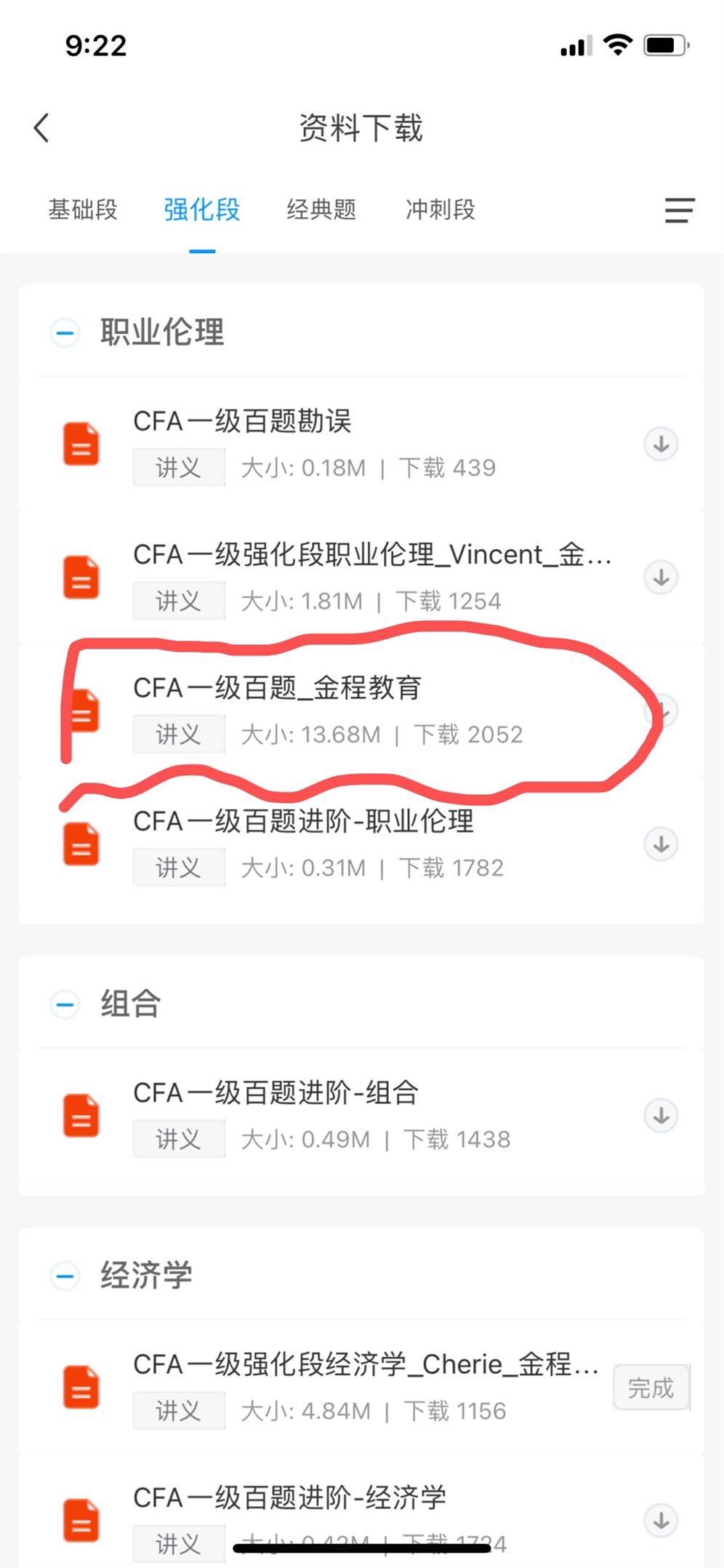 进入课程页面,在更多功能中找到资料下载,然后点击强化段,在第一个职业伦理下找到CFA一级百题。