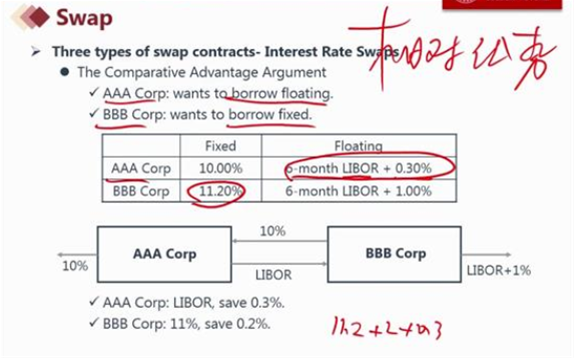 BBB公司,想以Fixed rate借款,但是成本是11.2%,高于了AAA;AAA想以浮动利率Libor借款,而不是Libor+0.3%