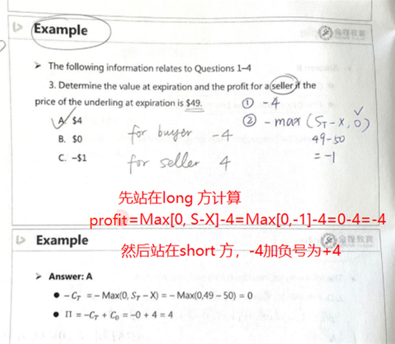 1 不是在-1上加负号。在0和-1中取大值0,内在价值IV=0,减去期权费为-4,然后加负号,解析过程如图。第二个截图的题目你算的是正确的。