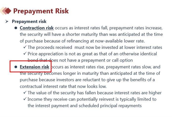 Q14、在那个正凸性的价格收益率曲线上看,利率上升,Duration不是会下降么,应该是还款更快了啊,应该是contraction risk啊