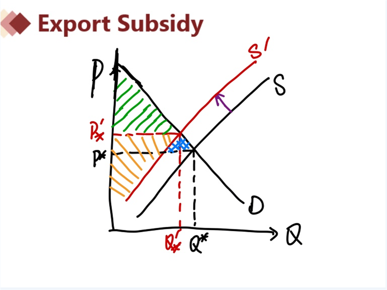 出口补贴,指的是一国政府为了降低出口商品的价格,增加其在国际市场的竞争力,在出口某商品时给予出口商的现金补贴或财政上的优惠待遇 。那么此时,出口补贴——政府支出由于提供补贴而增加,而生产商因出口即可获得补贴从而会优先选择出口——使得国内市场的供给减少——国内市场价格增加——消费者剩余减少,社会福利减少。(国内供求见下图2)