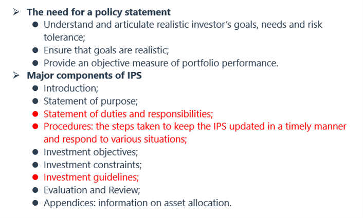 题目问的是IPS中,以下哪一个和顾客个人独特的需求联系最为紧密?A 讲的是投资流程的描述,C 有关责任归属的问题。C 投资指导性描述,例如主动投资、被动投资、选取指数(需要依据投资者个人的需求来判断,体现了更加紧密的特点)。