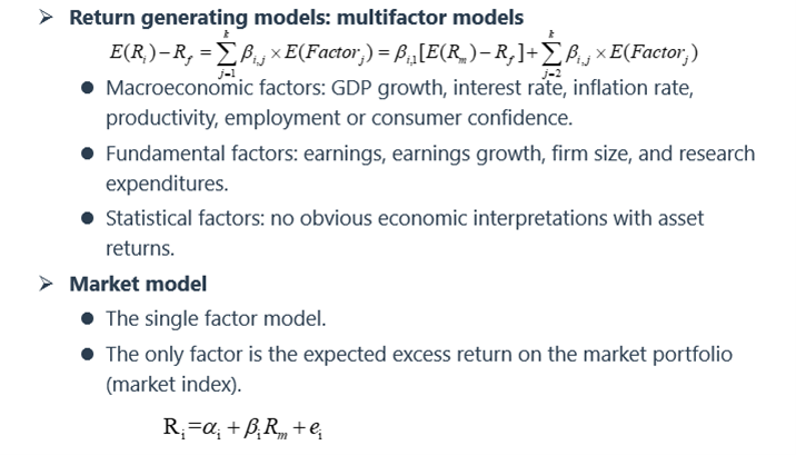 Return-generating models直接翻译是收益产生模型,其实在解释收益率可以被哪些因素解释。这个models包含很多模型,例如CAPM模型,市场组合的超额收益率和Beta可以解释单个资产收益率的大小。CAPM的横纵坐标是BetaCAPM的横坐标是贝塔。