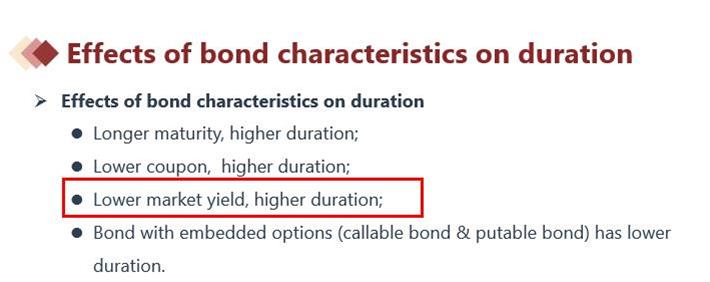 这道题问的其实就是影响duration的因素里面哪一个说的是错误的,见下图讲义。yield和久期是呈反比的,因此C错误