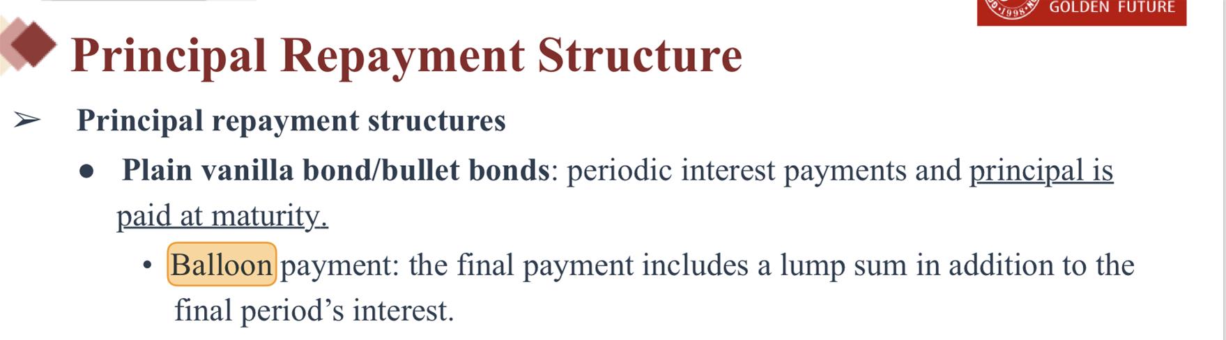同学你好,见下图讲义balloon payment主要特征就是说最后一期本金偿还数额很大。前期可以提前偿还一部分,但要保证最后一期偿还的本金额最大。