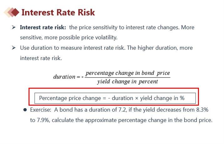 这道题涉及到的公式就是用久期来计算债券价格的变化,见下图