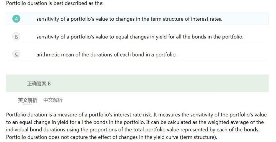 └(^o^)┘同学你好, 这边看解析都是全的没有问题。这道题就是关于portfolio duration的定义概念:利率平行移动所导致的组合价值的变动,也就是B选项的描述为乘风破浪的自己【点赞】让我们知晓您对答疑服务的支持~