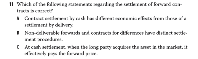 B "non-deliverable forwards"和“contracts for differents”是同一种合约的名字,都是“Cash-settled forward contracts”,有相同的交割流程,只不过名字不一样。表述应该是“same”