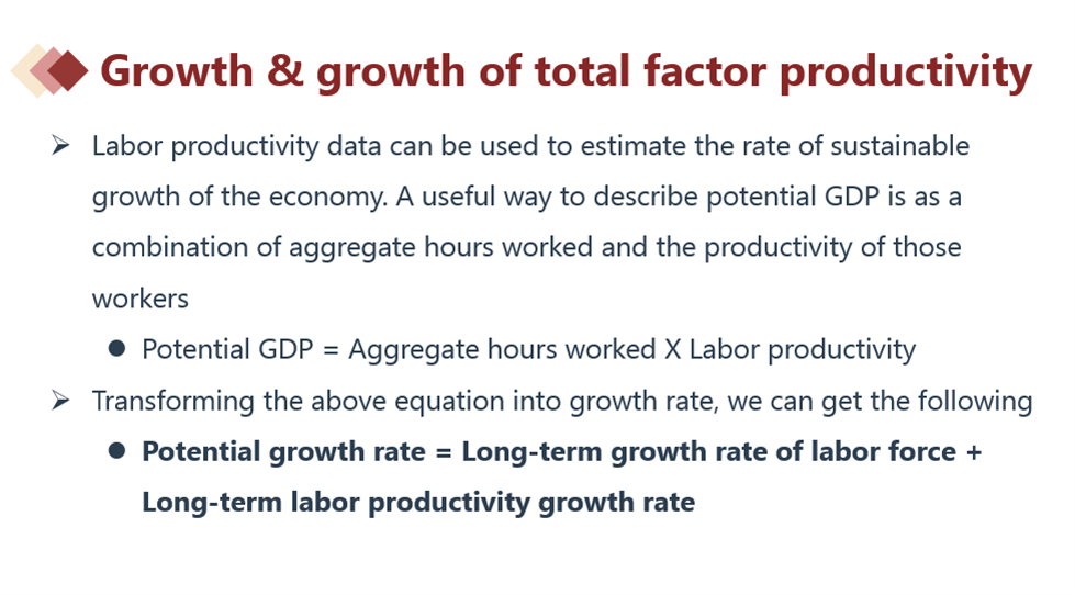 上图中公式是 △%Y (Potential growth rate )= △%L (Long-term growth rate of labor force ) + △%y (Long-term labor productivity growth rate)